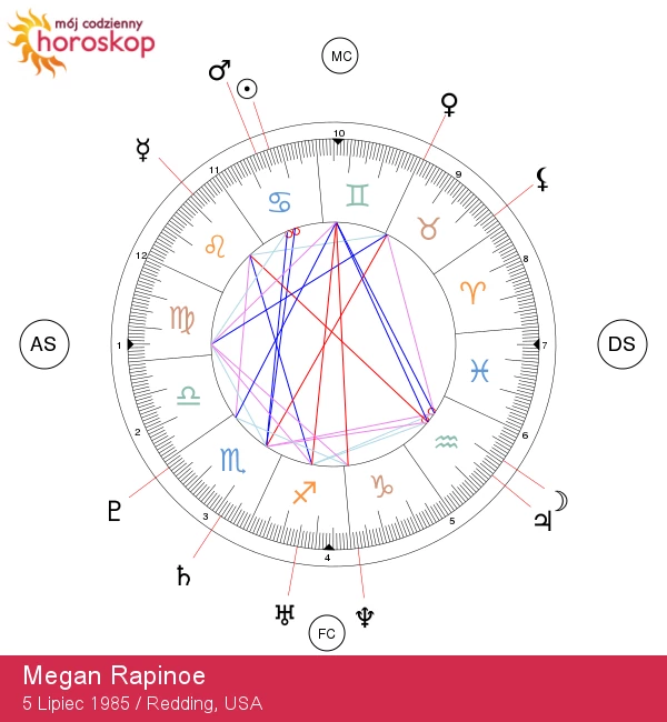 Witamy w kosmicznej podróży niesamowitej Megan Rapinoe, urodzonej 5 lipca 1985 roku o godz. 12:30 w słonecznym Redding w Kalifornii! Jako dumny Rak, Megan wciela w siebie esencję opiekuńczej duszy połączonej z silną determinacją, co czyni ją zarówno empatyczną liderką, jak i zaciętą koleżanką z drużyny. Kiedy Księżyc oświetla jej emocjonalny świat, przelewa swoje pasje w potężne występy zarówno na boisku, jak i poza nim.